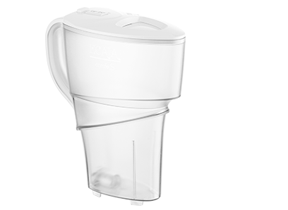 Eine stilvoll geschwungene Glaskaraffe, mit einem funktionellen Aufsatz und individuellen Filterkartuschen, gefertigt aus hochwertigen und recyclebaren Kunststoffen, garantiert beste Qualität.